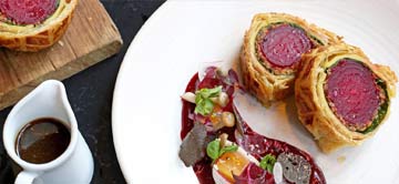 With a sharp knife, cut two slices of Beet Wellington, and position on the other side of the plate